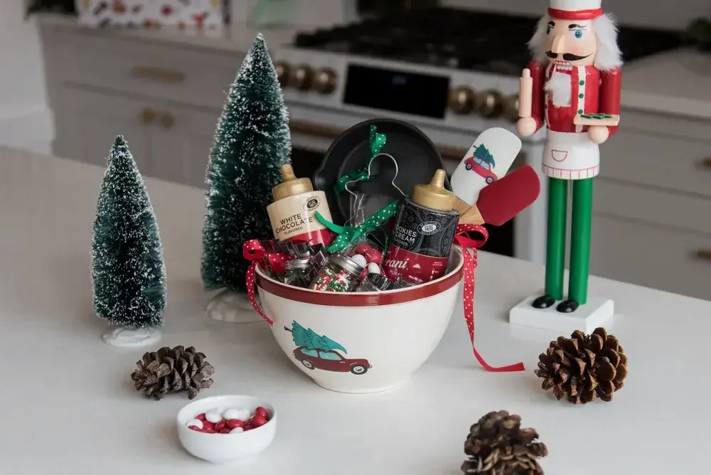 Adding some cookie mix or homemade recipe is the perfect way to take these gourmet gift baskets up a notch. From classic chocolate chip cookies to a seasonal cookie recipe like a Christmas shortbread cookie, or festive sugar cookies, the ways to tailor your gift basket to unique cookie flavors is honestly endless!